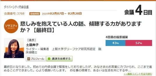 株式会社イー・ウーマン(本社:東京都港区、代表取締役社長:佐々木かをり)が運営する「ダイバーシティ円卓会議」では、2月に3768テーマ目としてグリーフケアを議論。様々な視点や体験が集まりました。