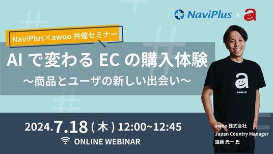 EC向けマーケティングソリューションを提供するナビプラス株式会社(デジタルガレージグループ会社 / 本社:東京都渋谷区、代表取締役:清水 和徳、以下:ナビプラス)は、awoo株式会社(本社:東京都渋谷区、代表取締役:林 思吾、以下:awoo)と、『AIで変わるECの購入体験~商品とユーザの新しい出会い~』をテーマとした共催セミナーを2024年7月18日(木)に開催いたします。