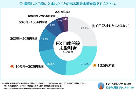 - FX口座開設済み・取引未経験者の4人に3人が入金経験があるが、その多くが50万円未満の少額にとどまっている