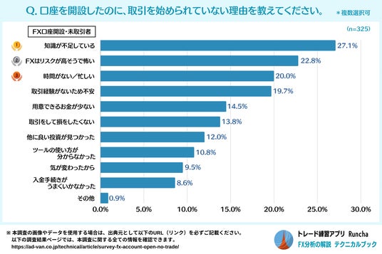 テクニカル分析専門サイト『テクニカルブック』は、FXでは口座開設をしているのに取引を始めない人が多い中、その原因を調査する目的で、FXの口座開設済みで取引経験がない20歳以上の男女325名を対象にアンケートを行いました。本調査からは、FXの取引を始める際に知識や経験の不足からくる不安を感じる人が多いことがわかってきました。
