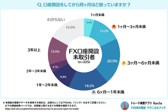 次のグラフは、「口座開設済みで取引経験がない」と回答したアンケート対象者が、口座開設してからどの程度の期間が経過しているか質問した結果です。