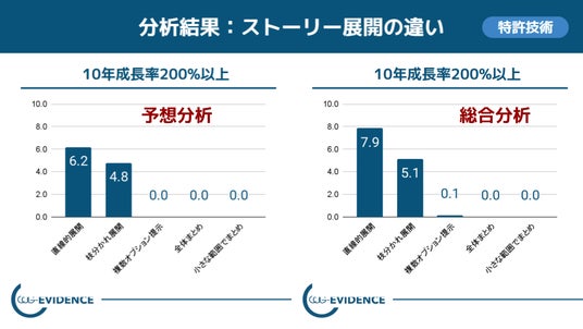 下の図は、スピーチのストーリー展開を分析した結果です。図の左は予測分析、図の右は総合分析の結果で、それぞれ10年での成長率が200%を超える企業の平均を提示しています。右では直線的展開と枝分かれ展開が増えており、メインになるストーリーとその周辺の説明が充実していることを示していますが、実際にはAMDがこれらの数値を大きく押し上げています。