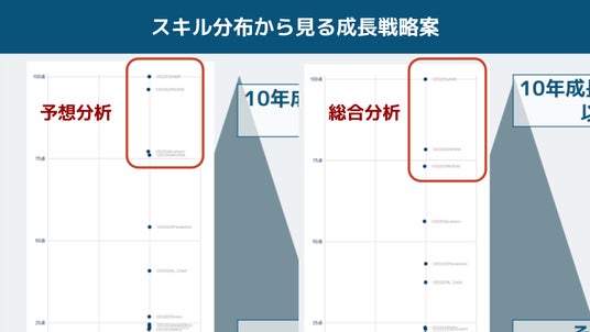 下の図では、10年成長率が高い会社のスピーチを基に各社のKeynoteスキルを分析して得点化して点として示し、上の点ほど高得点であることを表しています。図の左は予測分析した場合、図の右は総合分析した場合の各社の分析値です。予測分析では高い数値を示していた点が、総合分析では幾つか大きく落ちていることが分かります。