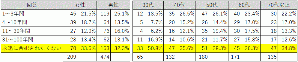 1.全体の回答では、「永遠に合祀されたくない」が32.7%とトップで「1~3年間」24.0%、「4~10年間」「11~30年間」が同率の15.1%と続く。「31~100年間」は最も少ない13.2%となった。“合祀される”という選択肢であれば、その期限については偏らない回答となり、全体の7割弱の方々が合祀される事に肯定的である結果となった。