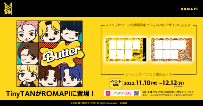株式会社セガ(本社:東京都品川区、代表取締役社長COO:杉野行雄、以下 セガ)は、好評稼働中のプリクラ機『ROMAPI(ろまぴ)』において、BTSのキャラクター「TinyTAN(タイニータン)」との期間限定イベント第2弾を2022年11月10日(木)から開催いたします。