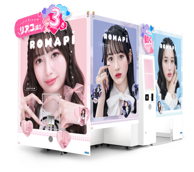 量産型・地雷系・儚げといったトレンドのファッションや文化を取り入れ、涙袋ぷっくりおめめ・マシュマロ白肌・圧倒的小顔感が実現できます。撮影ルームはピンク・パープル・ブルーの3種類あり、好みやファッションに合わせて「盛れる」ルームを選ぶことができます。ルームごとに撮影中のフルカラーLED演出や画面内のデザインも変わるので、その日の気分やファッションで撮影でき、これまでにない没入感で『ROMAPI』の世界観を楽しめます。さらに、プリクラ業界初、理想のM字リップになれる「スマイルリップ」や、キラキラとした瞳になれる「キャッチライト」、らくがき機能にはそれぞれのユーザーにあった「量産文字」「地雷漫画」「儚げスタンプ」など、量産型・地雷系・儚げ女子にぴったりの仕様を多数実装。もちろん、セガのプリクラシリーズ特徴の盛れる3秒動画「モーメント」も撮影できます。