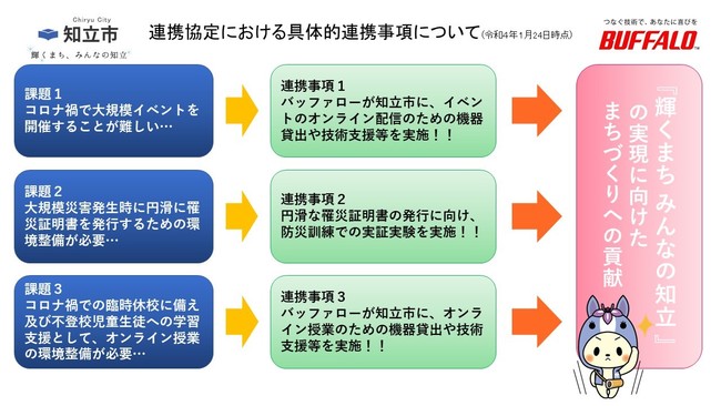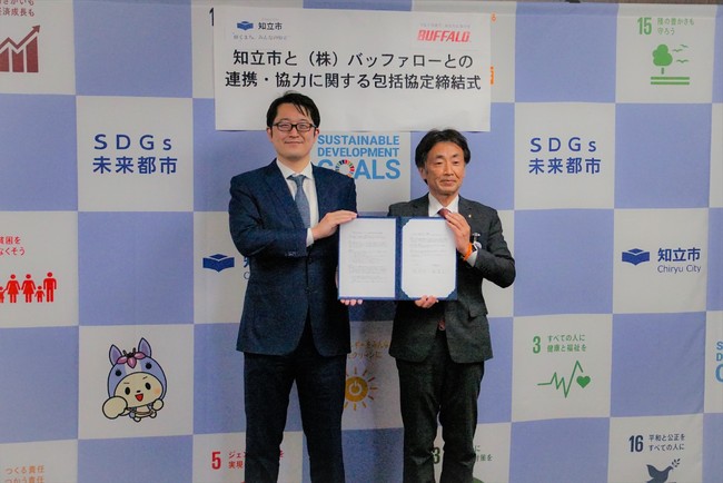 愛知県知立市(以下「知立市」)と、メルコホールディングス(東・名 6676)グループの株式会社バッファロー(本社:名古屋市、代表取締役社長:牧 寛之、以下「バッファロー」)は、『輝くまち みんなの知立』の実現に向けたまちづくりに貢献することを目的とし、2022年1月31日(月)、「連携・協力に関する包括協定」(以下「本協定」)を締結いたしました。