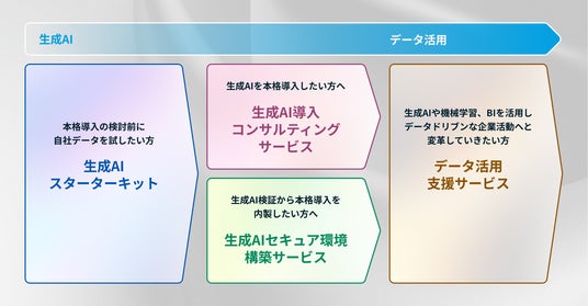 生成AI、機械学習、BIの導入から運用までを一貫してサポートし、AI・データ活用を最適化します。本サービスは、生成AIとデータ活用に関する一連のオファリングを体系化したものです。お客様の導入レベルや課題に合わせて、最適なサービスを組み合わせ、お客様のデータドリブンな意思決定を強力に支援します。