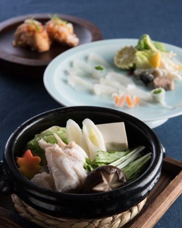 また懐石コーナーでは、「ふぐ刺し」や「ふぐの唐揚げ」、ふぐと野菜の出汁がきいた「ふぐちり」、「雑炊」を揃えたふぐづくしのコースに合わせ、銘醸蔵の日本酒を5種類ご用意。「唎き酒」をお愉しみいただけます。