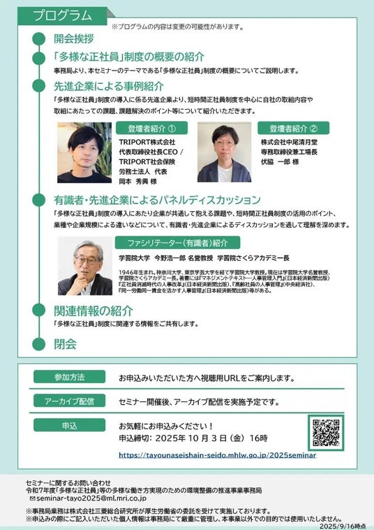 - 対象者 :「多様な正社員」制度にご関心のある事業主・人事労務担当者の皆さまなど