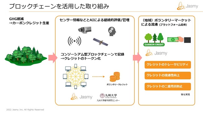 ジャスミー株式会社(本社:東京都港区 代表取締役:佐藤 一雅)は、一般社団法人Natural Capital(所在地:福岡県福岡市 代表理事:馬奈木俊介)による、ナチュラルキャピタルクレジットコンソーシアム(以下「NCCC」)の設立にともない、NCCCへの参画ならびにボランタリーのカーボンクレジット創出、市場の活性化に向けて、独自のブロックチェーン技術を活用した取り組みを行っていく事となりましたのでお知らせします。