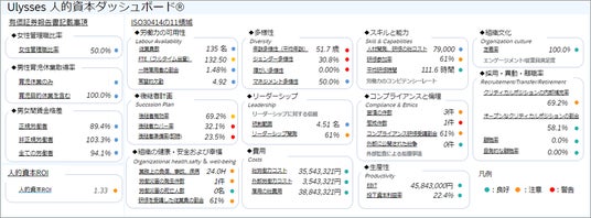 「Ulysses 人的資本ダッシュボード(R)」は、SAP SuccessFactors上で人的資本情報をダッシュボード化し適時確認できる仕組みであり、金融庁が公表した人的資本に関する有価証券報告書への記載義務項目と、ISO30414が規定する11領域の可視化、分析が可能です。手間のかかる有価証券報告書への記載事項も簡単に集計、出力できます。また、人的資本情報の管理についても、「何の情報をモニタリングすべきか」で悩む必要もなく、手軽に人的資本経営実現に必要な基本的な指標を可視化することができるので、人的資本情報を活用したPDCAのすべての局面において活用が可能です。