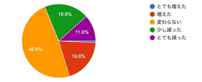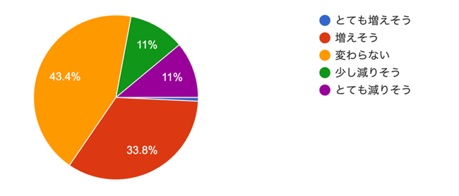 今後の集客予想を尋ねたところ、半数近くの43.4%の方が「変わらない」、34.5%が「増えそう」「とても増えそう」と回答しています。また、「減りそう」と答えた方は22%に留まっています。