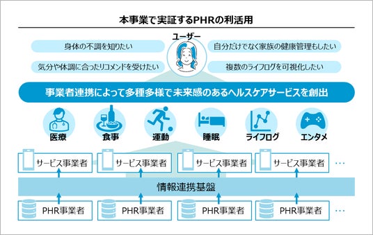 本事業は、実証後の2025年4月から開催される「いのち輝く未来社会」をテーマにした大阪・関西万博を通じて、事業者・国民がともに開かれた環境で多様なPHRとサービスが繋がり、新たな商品やサービスを生み出す事業者、それを安心して利用する国民の、より豊かな生活・体験が広がる未来への礎を築き、PHRによる“自然と健康になれる社会”の実現を目指しています。