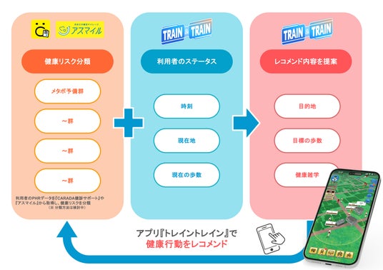 利用者のオプトインを得たPHR情報から、その利用者を独自の基準で層別化します。位置情報アプリ『トレイントレイン』で利用者の位置情報を取得し、アプリ上で健康行動をレコメンドします。