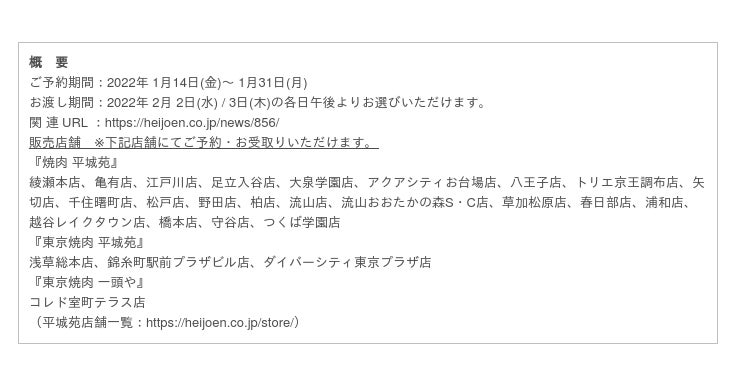 2020年に50年の節目を折り返した『平城苑』は、1970年、それまで和食店を営んでいた創業者が、和牛カルビの美味しさに感銘を受け、一軒の焼肉店を開いたのが始まりです。当時は韓国式の焼肉店が多くを占めていましたが、『平城苑』は日本人の料理人による日本人の味覚に合わせた焼肉店のスタイルを確立し、現在に至るまでそのプライドを貫いています。最大のこだわりは、全国の有名産地から黒毛和牛を一頭買いし、自社の加工場でじっくり熟成させてからお客様に提供していることです。年間約500頭仕入れる和牛はすべてA5等級。仕入れの目利き力、加工の技術力に加え、自社の配送システムでグループ全店の厨房へ届けており、美味しさはもちろんのこと安全・安心を提供しています。現在、『平城苑』グループは、焼肉店のほかステーキ、しゃぶしゃぶ、ハンバーガーの4つのカテゴリーで、首都圏、関西圏に36店舗、海外に1店舗を展開しています(2022年1月14日現在 / FC店含む)。 https://heijoen.co.jp/