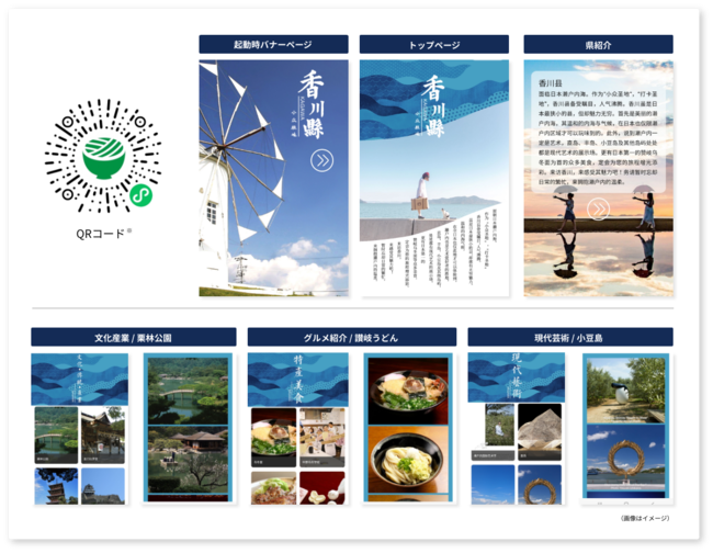 約13億人が日々の生活で利用している中国最大のSNS「WeChat(ウィーチャット)」内に、香川県の文化産業(栗林公園・金刀比羅宮・善通寺・丸亀城など)・香川県を代表するグルメ(讃岐うどん・骨付鳥・オリーブなど)、また、瀬戸内の持つ美しい景観と自然の中で流れてきた時間、文化、歴史を活かして展開されるアートや建築を紹介する現代芸術(瀬戸内国際芸術祭・直島・小豆島など)など、香川県の魅力を瀬戸内海の穏やかな、包み込むような豊かな自然をイメージしたデザインとともに、WeChat(ウィーチャット)ユーザーに対してより親しみやすく発信いたします。