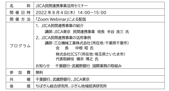 千葉銀行(頭取 米本 努)は、武蔵野銀行(頭取 長堀 和正)との業務提携「千葉・武蔵野アライアンス」に基づく提携施策として、2022年8月4日(木)、独立行政法人国際協力機構(以下、JICA)が実施している民間連携事業や海外進出に関心のある事業者を対象としたオンラインセミナー「JICA民間連携事業活用セミナー」を開催します。