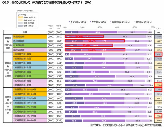 性別で見ると、就労忌避層の女性が67.6%で最も高く、積極就労層の女性が43.7%で最も不安が少なかった。年代別で見ると、就労忌避層の70~74歳が65.1%で最も高く、積極就労層の65~69歳が46.8%で最も不安が少なかった。