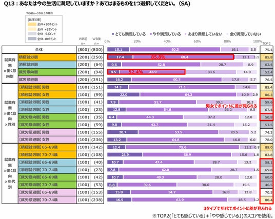 今の生活に満足をしているか尋ねたところ、積極就労層が85.8%、就労忌避層が76.5%、消極就労層が62.4%、就労意向層が52.4%と続いた。