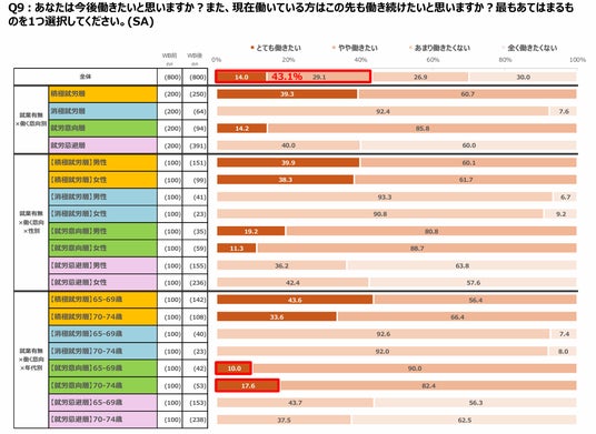 今後(も)働きたいと思うかを尋ねたところ、全体では43.1%が働きたいと回答した。「就労意向層」では65~69歳よりも、70~74歳の方が働きたい意向が強い。