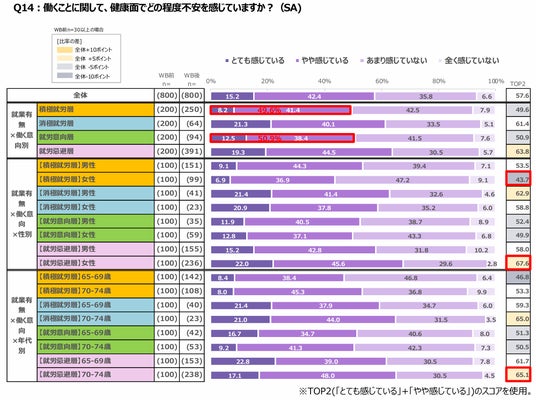● 健康面の不安を持っているのは5割で、積極就労層と同水準。(調査結果14.)
