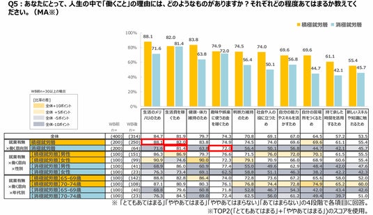 働いている人に、人生の中で「働くこと」の理由を尋ねたところ、積極就労層は「生活のメリハリのため」が88.1%で1位となり、2位には「生活費を稼ぐため」(82.0%)が続いた。一方、消極就労層は「生活費を稼ぐため」が81.4%で1位となり、2位には「趣味や娯楽に使うお金を稼ぐため」(72.0%)と続いた。