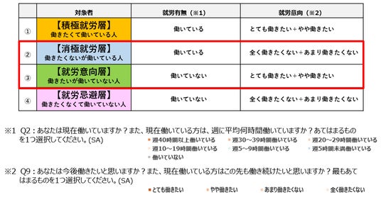 今回、特に着目した<消極就労層>、<就労意向層>のポイントは以下の通りです。