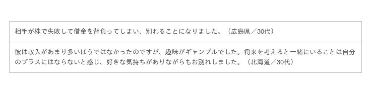 金銭的な理由では、借金やギャンブルなど金銭面での不安要素がツライ別れのキッカケとなってしまうようです。