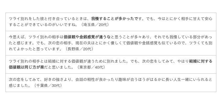 "次の恋の相手"と付き合いたいという女性からは、「ツライ別れの相手のときは、我慢していた」という意見が多くありました。