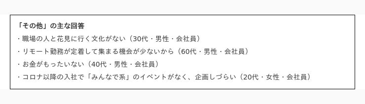 調査結果3.職場や仕事関連の人とのお花見に参加したい理由 3位「コロナ禍でこれまで同僚と交流する機会が少なかったため」