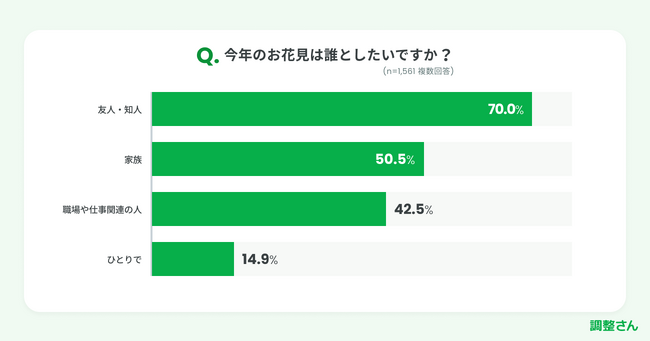 今年お花見を「開催/参加したいと思っている」または「開催/参加を決めている」と答えた人を対象に、今年のお花見は誰としたいか複数回答で聞きました。1位は「友人・知人」で全体の70%が選択しました。2位は「家族」で、半数となる50.5%でした。また、42.5%が「職場や仕事関連の人」とお花見をしたいと考えていることが分かりました。一方で「ひとりで」を選んだ人は14.9%に留まりました。