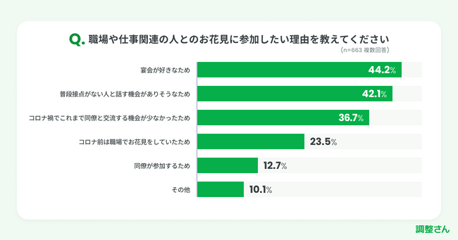 上記の質問で「職場や仕事関連の人」を選択した人に対し、理由を聞きました。複数回答での聞き取りでは「宴会が好きだから」が最も多く、44.2%となりました。2番目の多さとなったのは「普段接点がない人と話す機会がありそうなため」で、42.1%でした。また、「コロナ禍でこれまで同僚と交流する機会が少なかったため」を選んだのは36.7%で、3番目の多さとなりました。