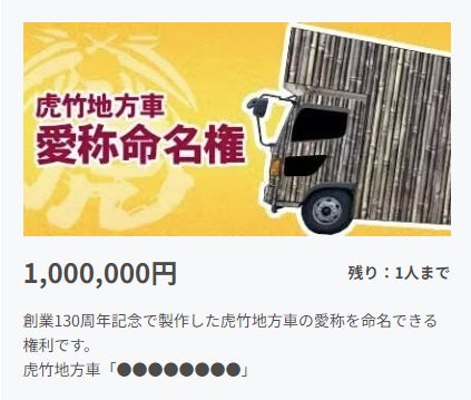 今回のクラウドファンディングにご協力いただいた皆様へのリターンとして、竹虎オリジナルの前掛けや虎竹特製かんざし、地方車煽り台からのよさこい鑑賞などをご用意していましたが、今回新たに「虎竹地方車の命名権」を追加しました。命名権の支援金は1,000,000円で、お一人の方が対象となります。