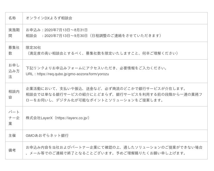 GMOあおぞらネット銀行株式会社(以下、当社)は、各種産業におけるデジタル化を支援するため、「オンラインDX(*1)よろず相談会」と称し、業務においてデジタル化を検討されている企業さまからのご相談を期間限定&社数限定で無料で受け付けます。