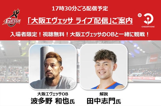 当日は、大阪エヴェッサOBの波多野和也氏と、元立川ダイス選手で現在エンゲートにてインターンシップを行っている田中志門氏による音声解説を配信します。来場者は自身のスマートフォンとイヤホンを使用し、試合観戦とあわせて新しい応援体験をお楽しみいただけます。
