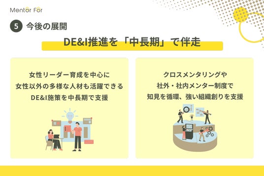 今後も、女性リーダー育成を中心に、女性以外の多様な人材も活躍できる組織を目指すためのDE&I推進を中長期で伴走支援します。社外・社内メンター制度に加え、メンターとメンティそれぞれが異なる企業の組み合わせで行う組織横断型のクロスメンタリングを通じ、知見を循環させることで強い組織づくりを目指します。