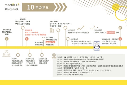 企業のDE&I(Diversity, Equity & Inclusion)・女性活躍推進を目的とした、社外メンターの育成・マッチング・社内メンター制度支援を提供する株式会社Mentor For(東京都渋谷区、代表取締役・池原真佐子、以下Mentor For)は、2024年9月1日をもちまして会社設立から10年、メンター事業開始から6周年を迎えます。皆様の日頃のご愛顧に心より感謝申し上げます。