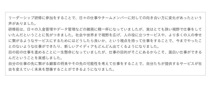 コロナ禍において様々な企業にてリモートワークが推進される一方で、リモートワークでメンバーをマネジメントする難しさを感じるという声も増えてきています。この研修は、社会が変化する中で、一人一人が組織を成長させるために必要なリーダーシップを学び、組織だけではなく、社員や顧客の成長を促すことができるようにすることを目的として実施されました。