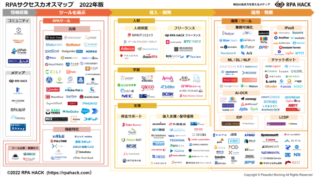 そのような状況に対応するため、それらサービスを企業のRPA導入におけるプロセス別に可視化した「RPAサクセスカオスマップ2022年版」として纏めました。
