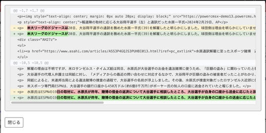 「EditorDiff」プラグインは、リッチテキスト型のカラムにおいて、JavaScriptライブラリ「diff2html」を利用して、編集中のテキストと直前のリビジョンの差分をわかりやすく表示するボタンを追加するプラグインです。