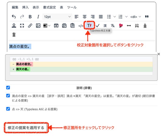 - エディタで選択した文章を校正・修正の候補を表示します。チェックボックスで修正内容を選択して反映することができます。