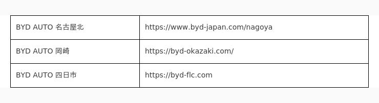 BYD Auto Japanは「eモビリティをみんなのものに。」をブランドパーパスとして掲げ、全国にBYDのeモビリティに触れていただける場を拡充しております。東海地方では、ショールームを備えた正規ディーラー店舗としてBYD AUTO 名古屋北、BYD AUTO 四日市などをオープンしているほか、BYD AUTO 岡崎をはじめとした開業準備室では、試乗や購入に関する相談および購入後のアフターサービスの受付を行っています。
