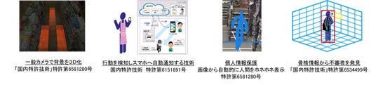 アースアイズはカメラのみで3D空間を把握できる特許を取得しています。例えば、センサーを使わずに、5メートル四方の中に何人いるのかをカメラだけで正確に捕捉できます。また個人情報保護の観点から、画像に映し出された人物を瞬時に代替画像(ホネホネ人間)にする技術も開発しました。