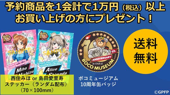 【1会計10,000円(税込)以上商品をご予約頂いた方に、「西住みほor島田愛里寿ステッカー(ランダム配布)」「新作ボコミュージアム10周年缶バッジ」プレゼント&送料無料!】