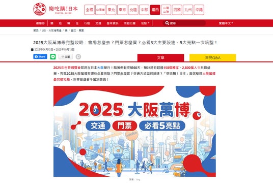 2024年4月1日~2025年3月10日までの期間で、「ラーチーゴー!日本・関西版」に掲載されている記事の閲覧数を集計すると、1位は「大阪万博の完全ガイド」となりました。記事ではチケットの購入方法や公共交通機関を利用した行き方、必見スポットやパビリオンなど、みどころを紹介しています。ラーチーゴー!日本の蔡 宇淮(さい・うかい)編集長は、「万博は10月まで開催されるため、台湾人・香港人にとっては次の日本旅行で行きたい旅先のひとつになっている可能性があります。数日間万博を楽しもうと計画する人もいるのではないでしょうか」と、万博関連記事が人気となる理由について分析しています。※4