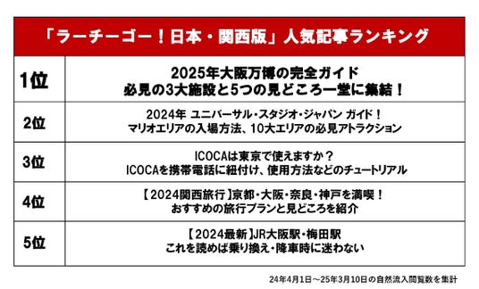 株式会社ジーリーメディアグループ(本社:東京都渋谷区 代表取締役:吉田皓一)は、台湾人・香港人向けで最大の訪日観光情報サイト「樂吃購(ラーチーゴー)!日本」関西版の人気記事について、ランキング形式でお知らせします。2024年4月1日から25年3月10日までの期間で閲覧数※1を集計したところ、1位は「大阪万博の完全ガイド」となりました。「ラーチーゴー!日本」は、月間のユニークユーザー数が340万人※2で、日本旅行を検討している多くの台湾人・香港人に利用されています。「大阪万博の完全ガイド」が1位となったことで、万博が台湾人・香港人にも注目されていることが示されました。また、Facebookを通じた発信では「ハローキティが万博日本館案内役に就任」のニュースが約30万人に閲覧され※3、SNSを通じた注目度も確認できました。