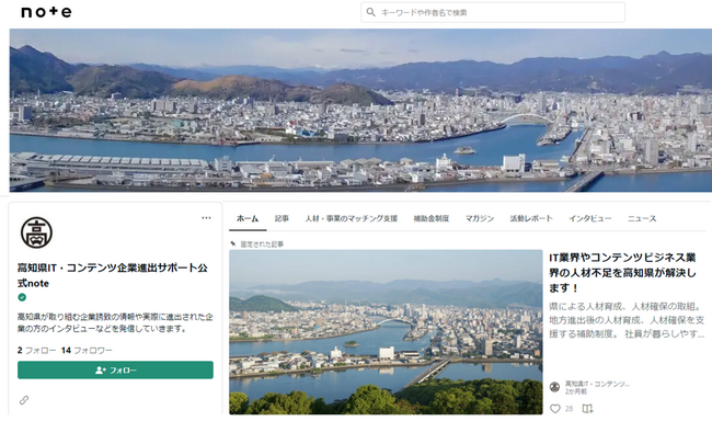 情報発信メディアプラットフォーム「note」に、高知県IT・コンテンツ企業進出サポートの公式アカウントを作成し、高知県が取り組む企業誘致の情報や実際に本県に進出された企業の方のインタビューなどを発信しています。