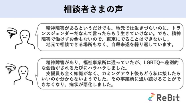 すると、LGBTQかつ精神障害や発達障害がある方々を中心に、のべ6000人からのご相談が殺到。このような喫緊の相談が届いている一方で、障害福祉サービスは、支援対象者の条件(通所圏内に居住していること等)があるため、全国からの相談の約70%は対象外。ReBitはみなさまのご寄付や助成をいただき、全国各地に向けてのオンラインでの相談支援と、関西・関東・東北で地域の団体と連携し相談支援や同行支援を実施してきました。