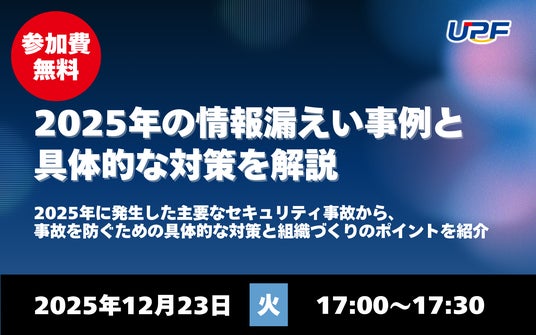 リスクマネジメント分野のコンサルティングサービスを提供する株式会社UPF(本社:東京都中央区、代表取締役:仲手川 啓、以下当社)は、2025年12月23日(火)17:00より、2025年に発生した情報漏えい事例をもとに対策を解説する無料オンラインセミナーを開催いたします。